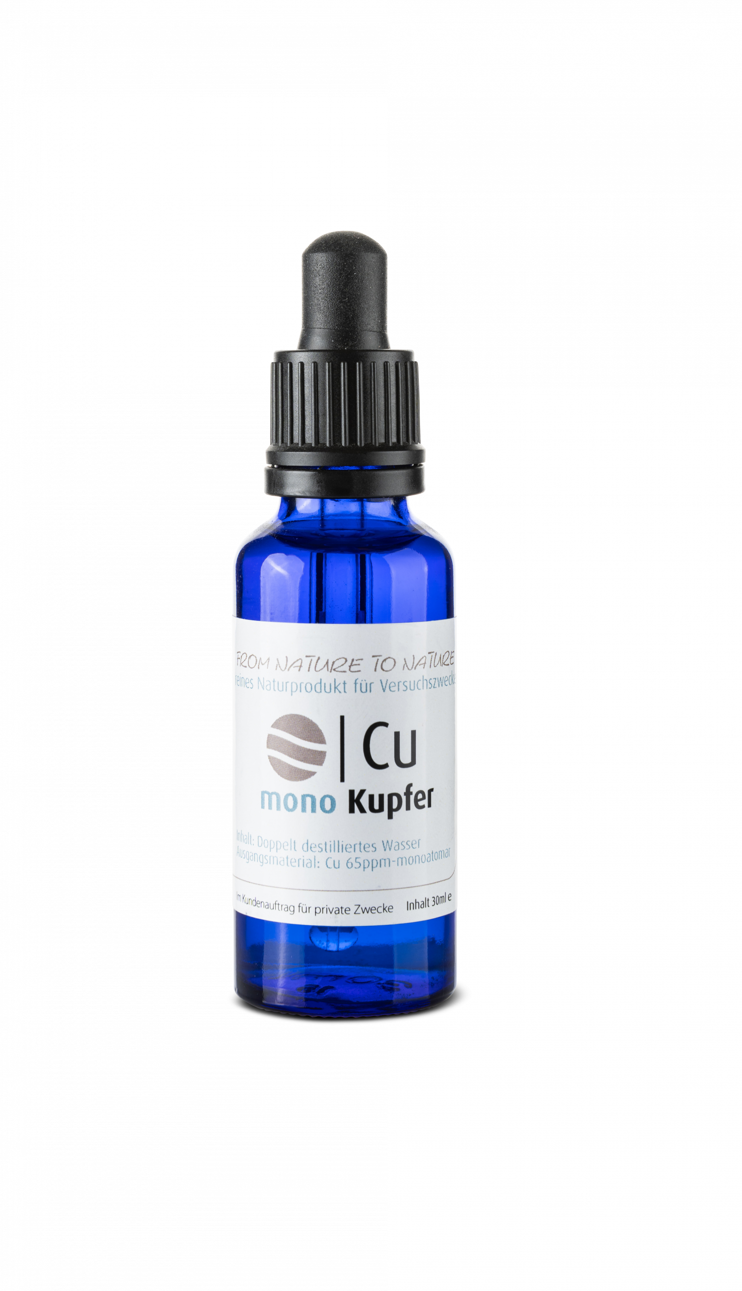 Unser monoatomares Kupfer wird aus hochwertigem kolloidalem Kupfer hergestellt und überzeugt durch außergewöhnlich reine Qualität in doppelt destilliertem Wasser.